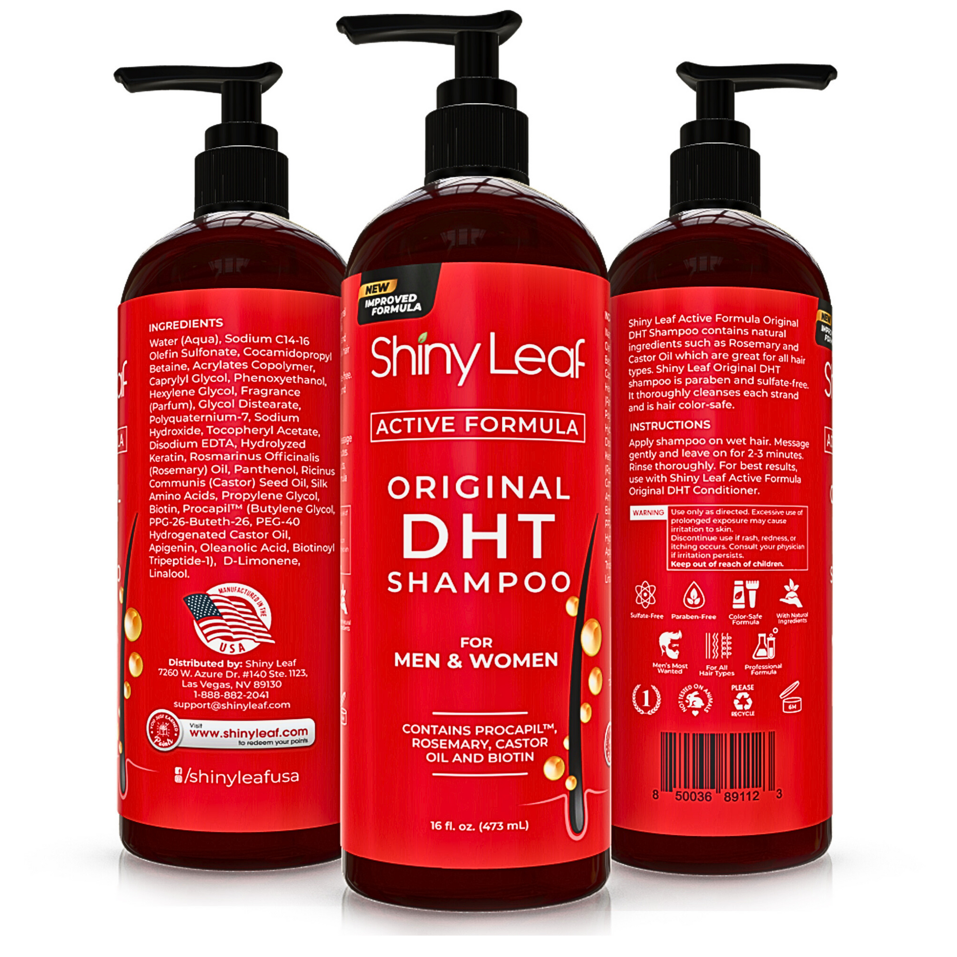 Erhalten Sie das aufsehenerregende Haar, das Sie sich schon immer gewünscht haben, mit Shiny Leaf's DHT Original Shampoo! Natürliche Inhaltsstoffe wie Rosmarinöl und Rizinusöl nähren Ihr Haar tiefgreifend, während die leistungsstarke Procapil-Formel hilft, schädliche DHT-Hormone zu blockieren, die zu Haarausfall führen können. Genießen Sie einen so luxuriösen Schaum, dass jeder neidisch sein wird – ganz gleich, ob Sie männlich oder weiblich sind. Verwöhnen Sie sich mit kräftigen und glänzenden Strähnen von der Wurzel bis zur Spitze – das nennen wir wunderschön!
